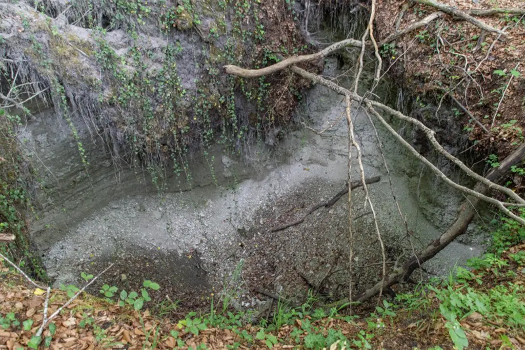 Voici une hêtraie sombre, qui ne paraît pas être différente de celles environnantes de la région proche - photo 1. Pourtant, elle est chargée d’histoire, des galeries de l’ancienne mine de gypse se trouvant dans son sous-sol. En témoignent deux cônes d’effondrement spectaculaires, dont l’un est récent - photo 2. Il est donc très dangereux de s’y aventurer.